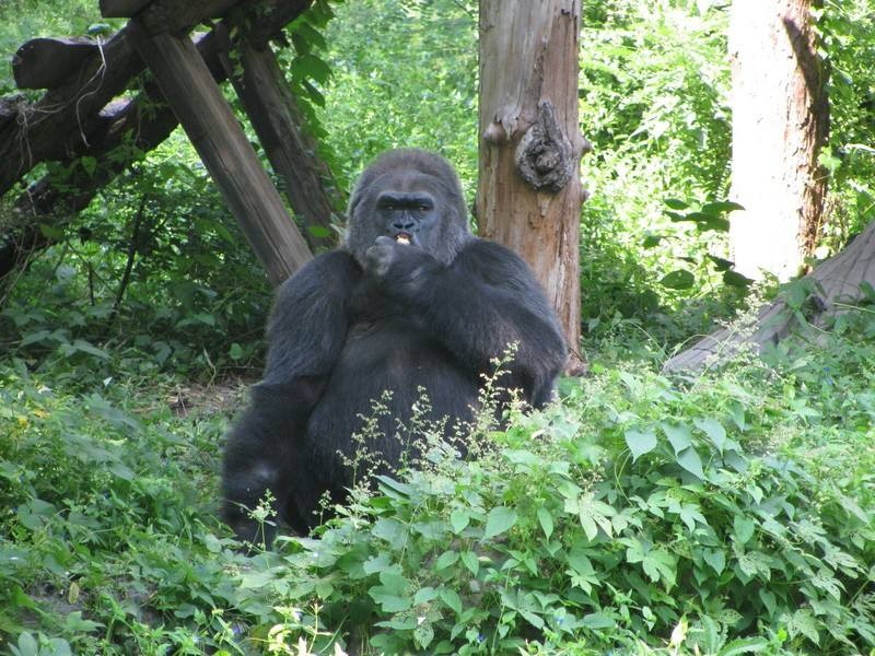 北京动物园大猩猩馆新馆建于1987年,展舍内建有猩猩日常活动的山石、栖架,背景绘有猩猩野外生活的壁画,展窗玻璃采用大尺寸34毫米厚的复合玻璃,保证捶击安全。室外运动场栽有高大的乔木和成丛的灌木,还有假山石和假的枯树干,很好地再现了野外环境,有利于动物玩耍、嬉戏,观展效果也很好。