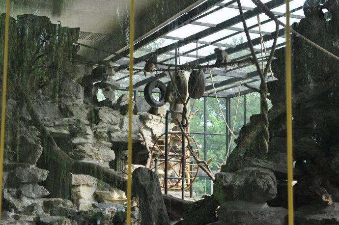 北京动物园历史最悠久的馆舍非东南侧的猴山莫属,2006年因为修路对原有的猴山进行拆除和改建,目前原有的猴山山体得以保留,但是观看方式已经不是当年的俯视模式,而是改成了一个大玻璃罩,投喂比较困难,但是平时交流还是比较方便的。