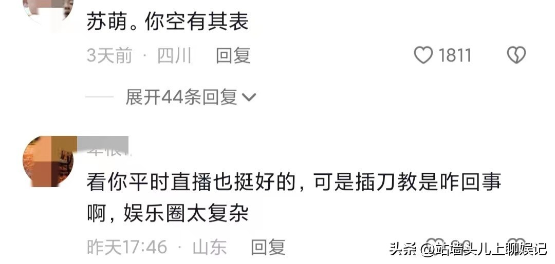 因为大家给她的评论多是“插刀教”“印小天”“道歉”等字眼。