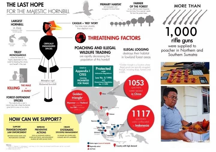 2016年,伦敦非政府组织环境调查署发布了一则报告,指出在2010年到2015年当中,中国和印尼政府没收的盔犀鸟头骨数量,超过了2000枚。这个恐怖的数字意味着,即使在明令禁止,却依旧有数不尽的盔犀鸟在偷猎者的手下死去。