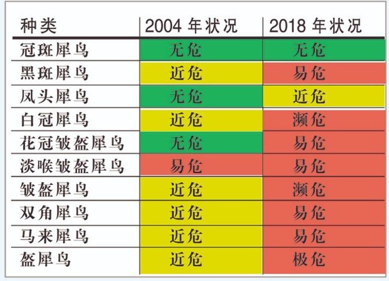 随着猎杀盔犀鸟的情况越来越严重,国际自然保护联盟不得不一再发出警告,并且提升这种鸟类的保护级别。短短几年当中,就从近危变为了极危,而地下交易当中盔犀鸟头骨制品的不断升值的情况,却还是将这种鸟推入了无法被拯救的深渊。