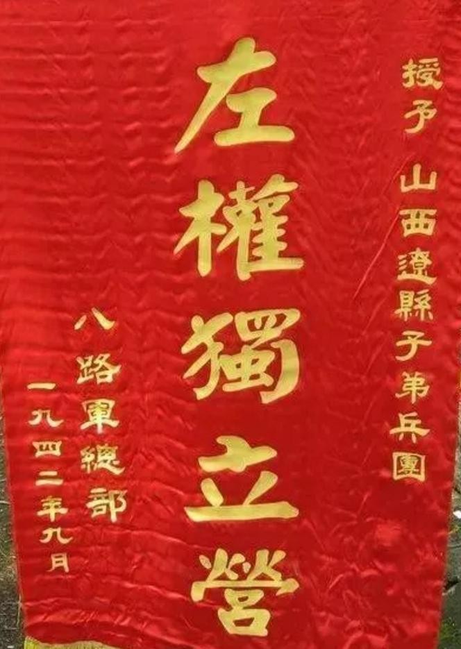 这面战旗诞生于1942年9月,在左权将军的公祭时,八路军总部授予由左权亲自指挥过的500名热血青年组成的山西辽县子弟兵团为"左权独立营"荣誉称号。