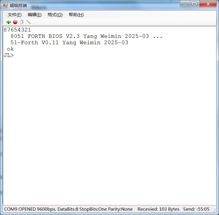 超级终端启动后,打开单片机的电源,可以看到51-FORTH系统的启动过程: