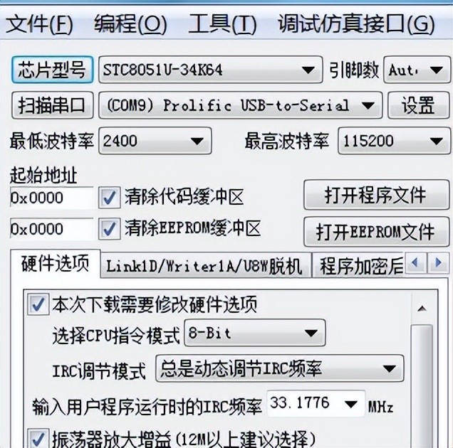 附件1解压后的“51_FORTH_V011.HEX”是51-FORTH针对“AI8051U”的V0.11学习版本,用STC-ISP软件以8-BIT模式和33.1776MHz的主频烧录到“AI8051U/STC8051U”单片机中即可。以“AIapp-ISP-v6.95E.exe”为例: