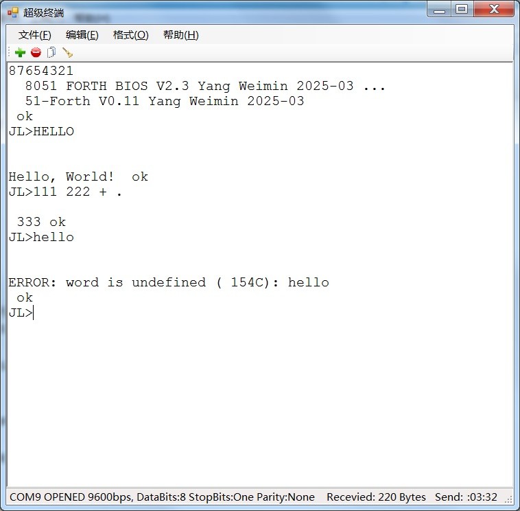 上面“HELLO”是51-FORTH命令,执行后再屏幕上显示“Hello, World!”字符串,后面跟的“ok”是命令正常执行的信息。