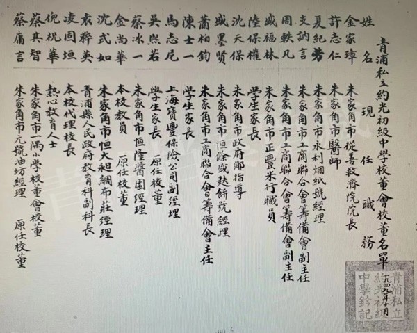 私立济青中学是珠里第一所中学,校名有救济失学青年的意思,其前身是私立近知中等补习学塾,校址设在城隍庙钱徐氏存古祠堂内,当时朱家角商会会长杨志坚任校董事会董事长,程士敏任校长。