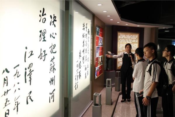 苏州河工业文明展示馆内,有关苏州河治理的图文