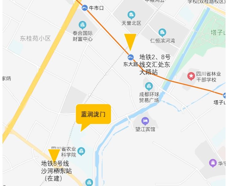 蓝润泷门位于锦江区汇源南路与通盈街交叉口,与镏金岁月小区一街之隔,东侧是新沙河阳光水岸。