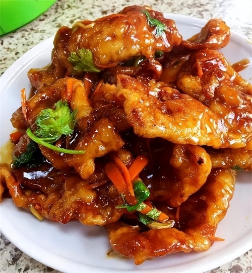 酸甜锅包肉,以其独特的酸甜风味,成为餐桌上的一道亮丽风景。精选猪里脊肉,切成均匀的薄片,腌制后裹上薄薄一层淀粉,经过精心炸制,变得金黄酥脆。最后,淋上秘制的糖醋汁,酸甜交织的酱汁渗透至每一片肉中,使得锅包肉外酥里嫩,酸甜可口。