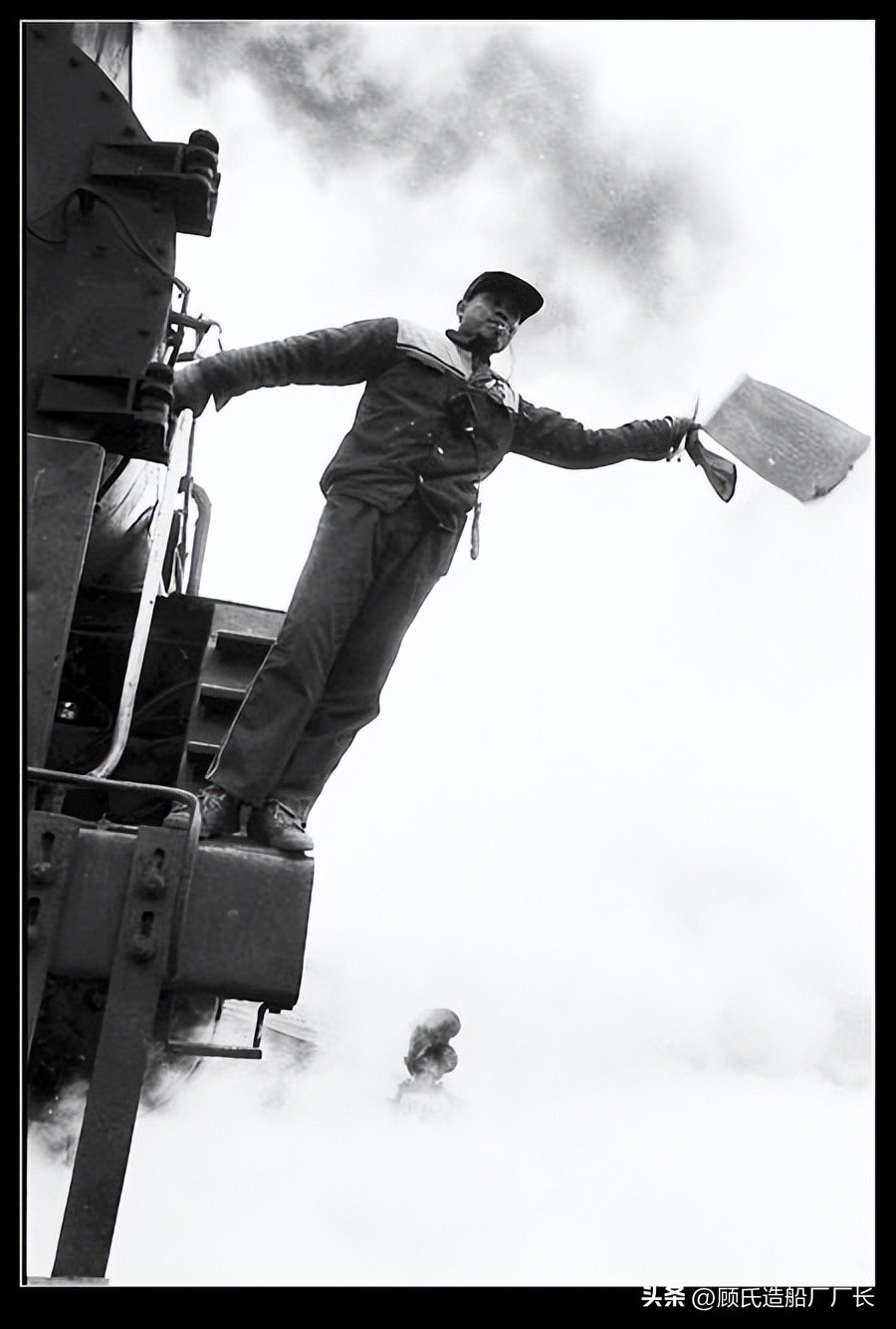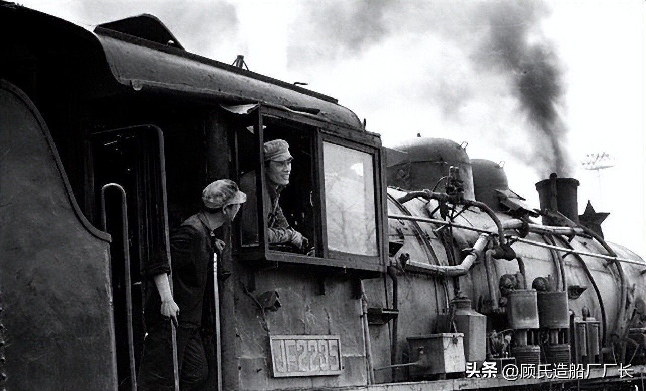 解放型蒸汽机车的司机室内的乘务员