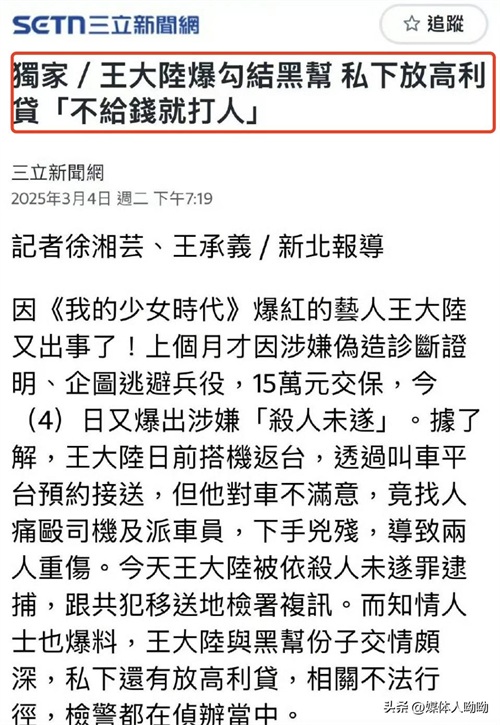 杀人未遂,逃役,勾结黑帮放贷!曾经偶像男神王大陆,跌落谷底