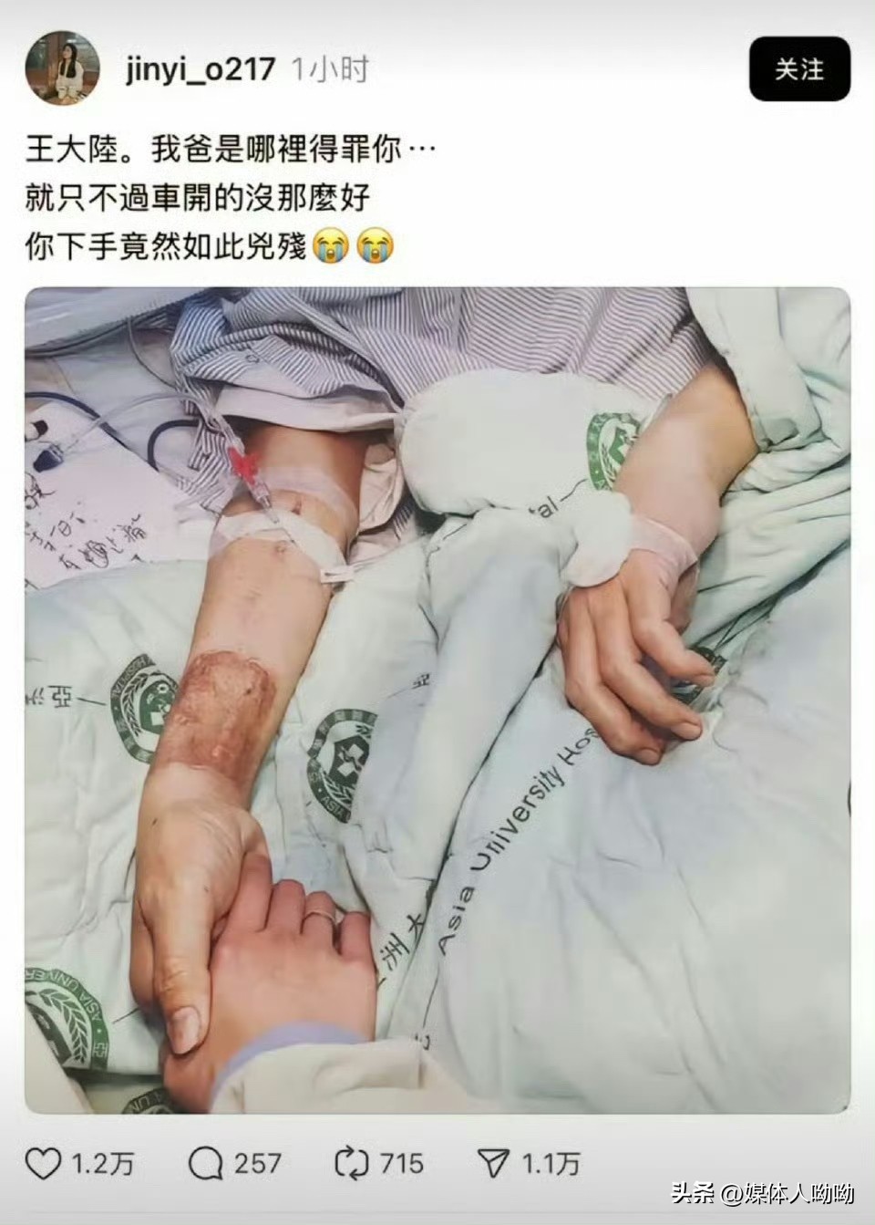 有疑似被王大陆殴司机女儿发文配图:你竟下手如此凶残!
