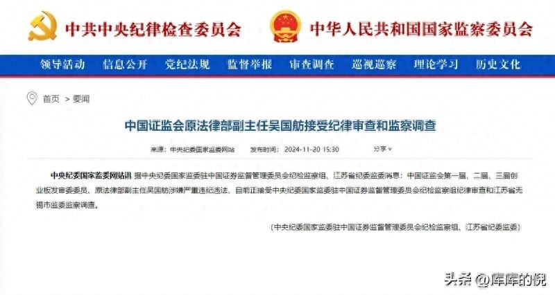 11月20日,中央纪委国家监委网站据中央纪委国家监委驻中国证券监督管理委员会河和江苏省纪委监委消息称,原法律部副主任吴国舫涉嫌严重违纪违法,目前正接受中央纪委国家监委驻中国证券监督管理委员会纪检监察组纪律审查和江苏省无锡市监委监察调查。