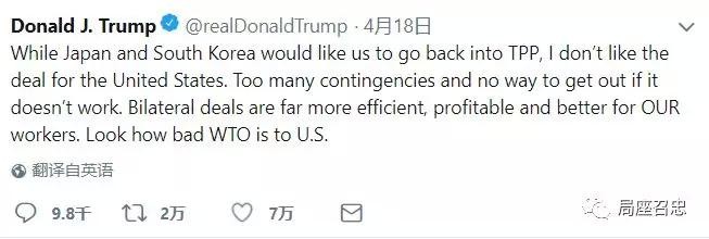 “虽然日本和韩国希望美国回归TPP,但我认为这协议不适合美国。现有的(TPP)协议偶然性太大,且一旦协议失效,又找不到摆脱局面的方法。相比之下,双边协议更为行之有效、更令人受益。看看WTO如何恶劣地对待美国就知道了。”