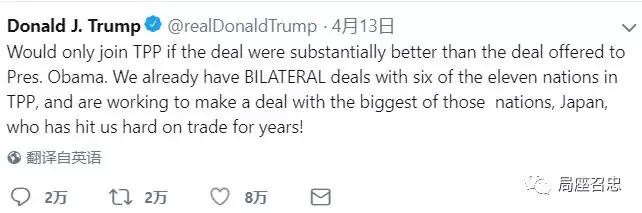 然后,特朗普随后就发布了推特往日本身上扎了一刀:只有在获得更多实际利益的情况下,他才会考虑加入TPP,“日本已经在贸易上严重打击我们好多年!”