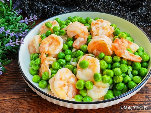【虾仁炒豌豆】所需材料:豌豆半斤、大虾仁10只左右、油盐适量、葱1段、姜1片、大蒜2瓣、料酒半汤匙、白胡椒粉半茶匙、鸡精1茶匙、水淀粉适量、