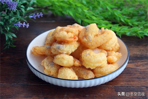 7.虾仁捞出后,放一会儿,会回软,再复炸一次,表面就会变得金黄,酥香。