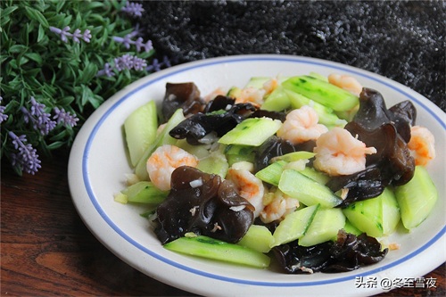 【青瓜炒虾仁】所需材料:大虾仁10几个、黄瓜2根、水发木耳1把、油盐适量、香油半汤匙、葱1段、姜2片、大蒜2瓣、鸡精1茶匙、白胡椒粉半茶匙、料酒半汤匙、水淀粉适量、
