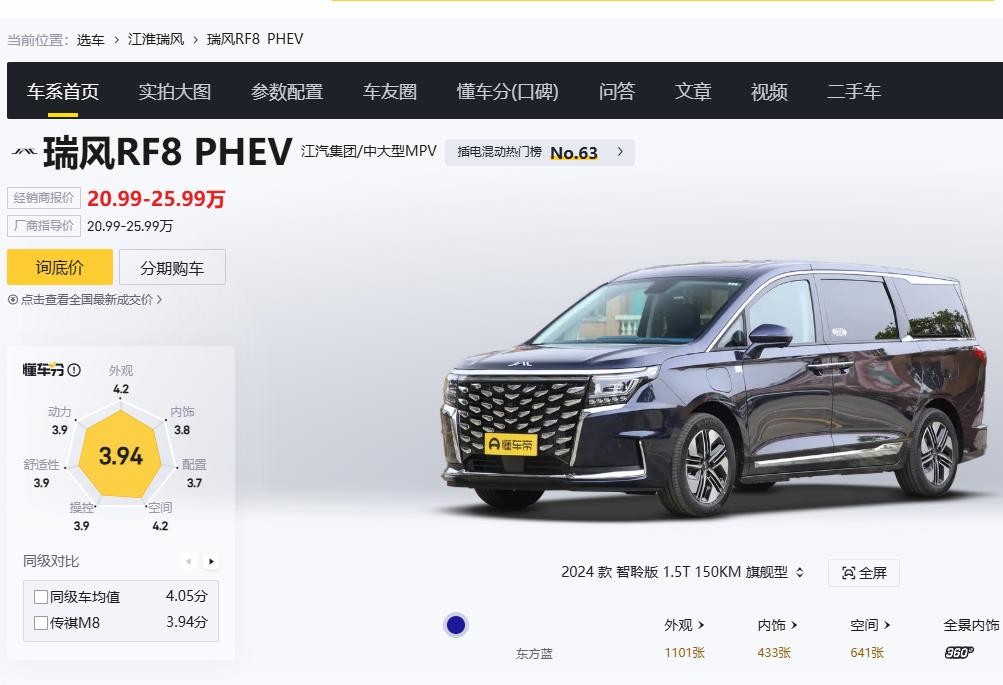 今天要介绍的这款新车,来自于江淮汽车旗下的MPV车型——瑞风RF8 PHEV智聆版,该车的官方指导价为20.99-25.99万元,并且配备了更为舒适的航空座椅,搭载的是时下主流的插电式混合动力系统,我们一起来分析分析它的产品力究竟如何?