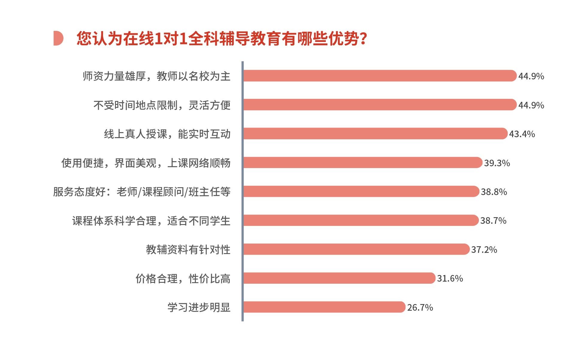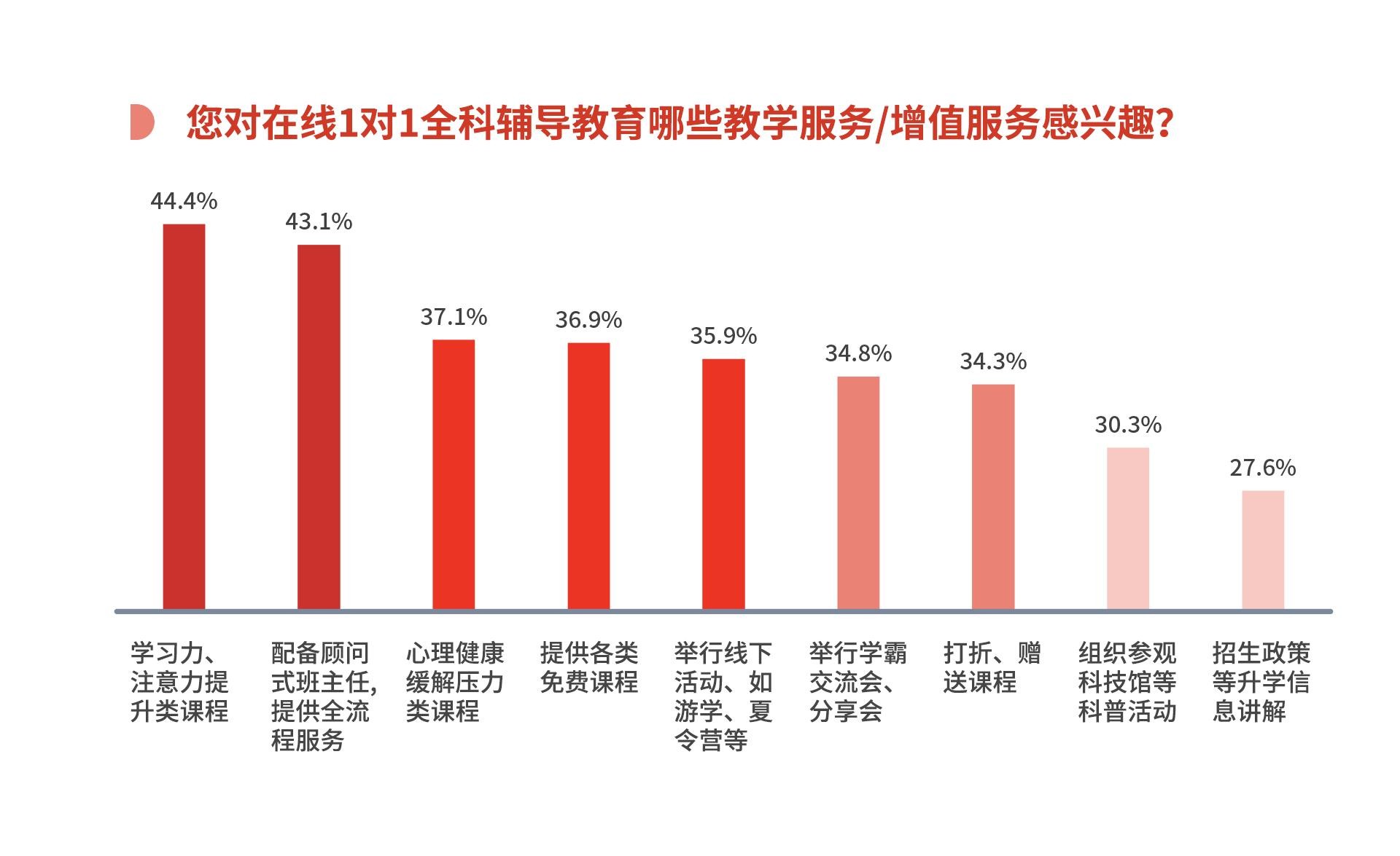 另外,调查显示,不受时间地点限制,灵活方便;师资力量雄厚、教师以知名高校为主等是在线1对1全科辅导教育品牌的主要优势。具体而言,30—34岁家长更看重“线上真人授课,能实时互动”,35—44岁家长更看重“不受时间地点限制,灵活方便”,45岁以上家长更看重“服务态度”。该行业主要针对全科教育培训的现状,很多家长希望能更全面的培养孩子的学习能力,希望教育机构能够提供更多的增值课程。调查显示,多达44.4%的受访家长表示,学习力、注意力提升类课程是自己最感兴趣的教学服务。