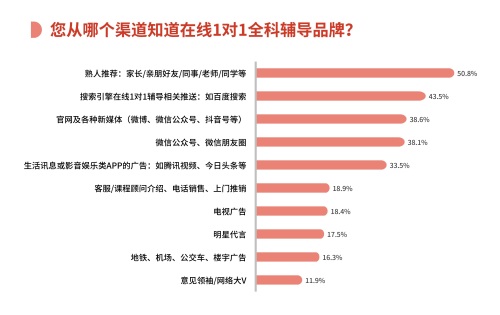 从这项调查的数据结果来看,“口碑”二字尤为重要,多达50.8%的受访者表示,他们了解在线1对1全科辅导教育品牌的主要渠道是通过熟人推荐,传统销售推销模式并未成为品牌传播的有效途径,其中三线城市选择熟人推荐的比例为54.1%,高于一二线城市。