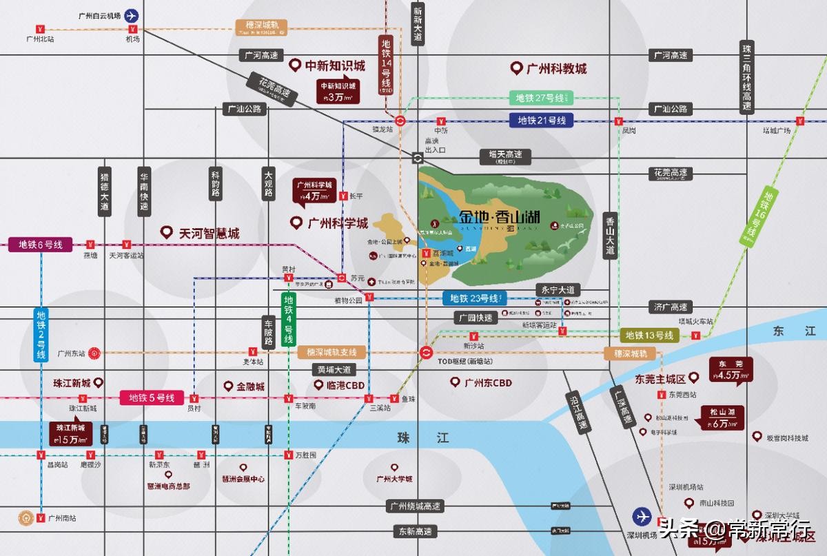 以花莞高速为例,金地·香山湖,出门即达花莞高速可通达珠江新城。更可南至珠三角环线高速,直达深圳,东莞。