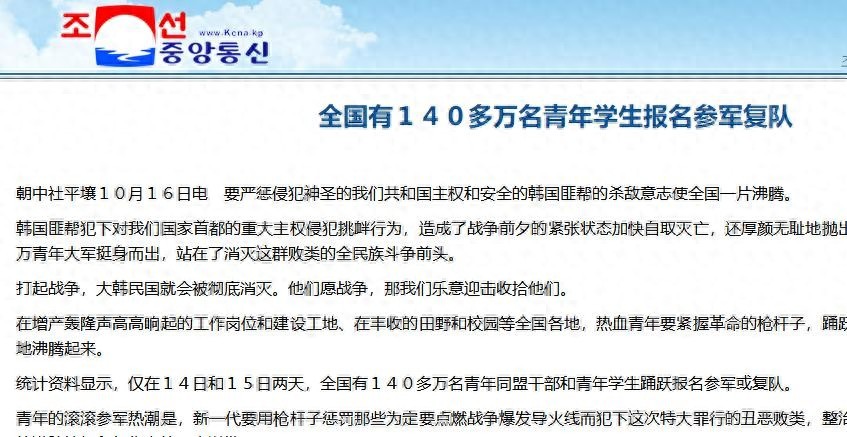 朝鲜媒体的报道画面感十足,写道:在增产轰隆声高高响起的工作岗位和建设工地、在丰收的田野和校园等全国各地,热血青年要紧握革命的枪杆子,踊跃投入歼敌圣战的参军热潮,熔岩般地沸腾起来。