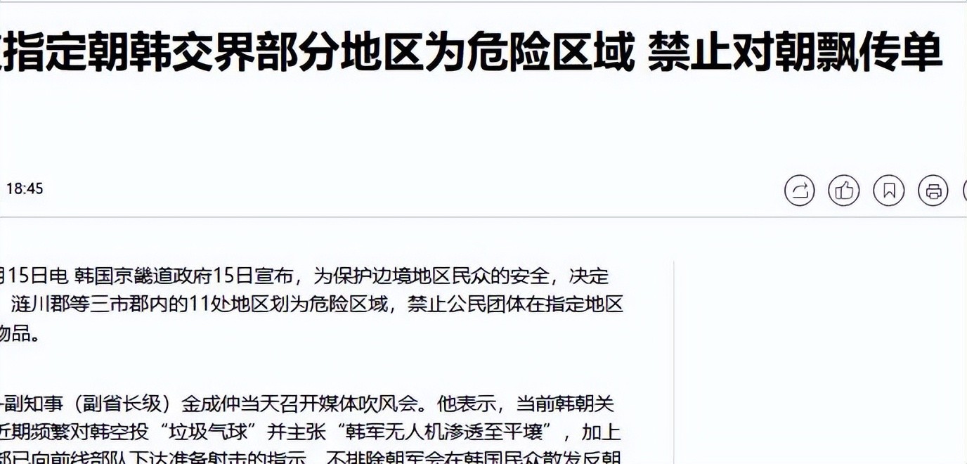 朝鲜这次态度强硬的一个原因就是针对反朝传单投入到首都平壤上空非常愤怒,韩国此举表面上是防止朝鲜对韩国投放传单进行射击,实际就是表明不想挑衅的态度。