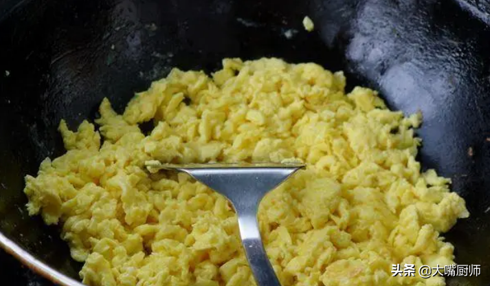 3、炒鸡蛋时,要热油下锅,这样鸡蛋才更加蓬松,下锅后用铲子不停地搅拌,很快就变成均匀的碎块了。