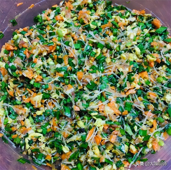 食材:五花肉500克、韭菜300克、胡萝卜250克、龙口粉丝2块、香菇100克、鸡蛋2个。