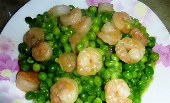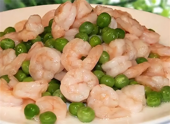 【主要食材】:鲜白虾500克,青豌豆荚400克