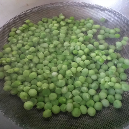 第二步、豌豆颗焯水。锅中添上一大碗清水,大火将水烧开后,加1茶匙食盐再滴入几滴食用油,将青豌豆颗放入开水锅中煮,时间1分钟左右即可捞出来,迅速过一遍凉水,控干水分;这样豌豆颗颜色会保持翠绿,不会泛黄。