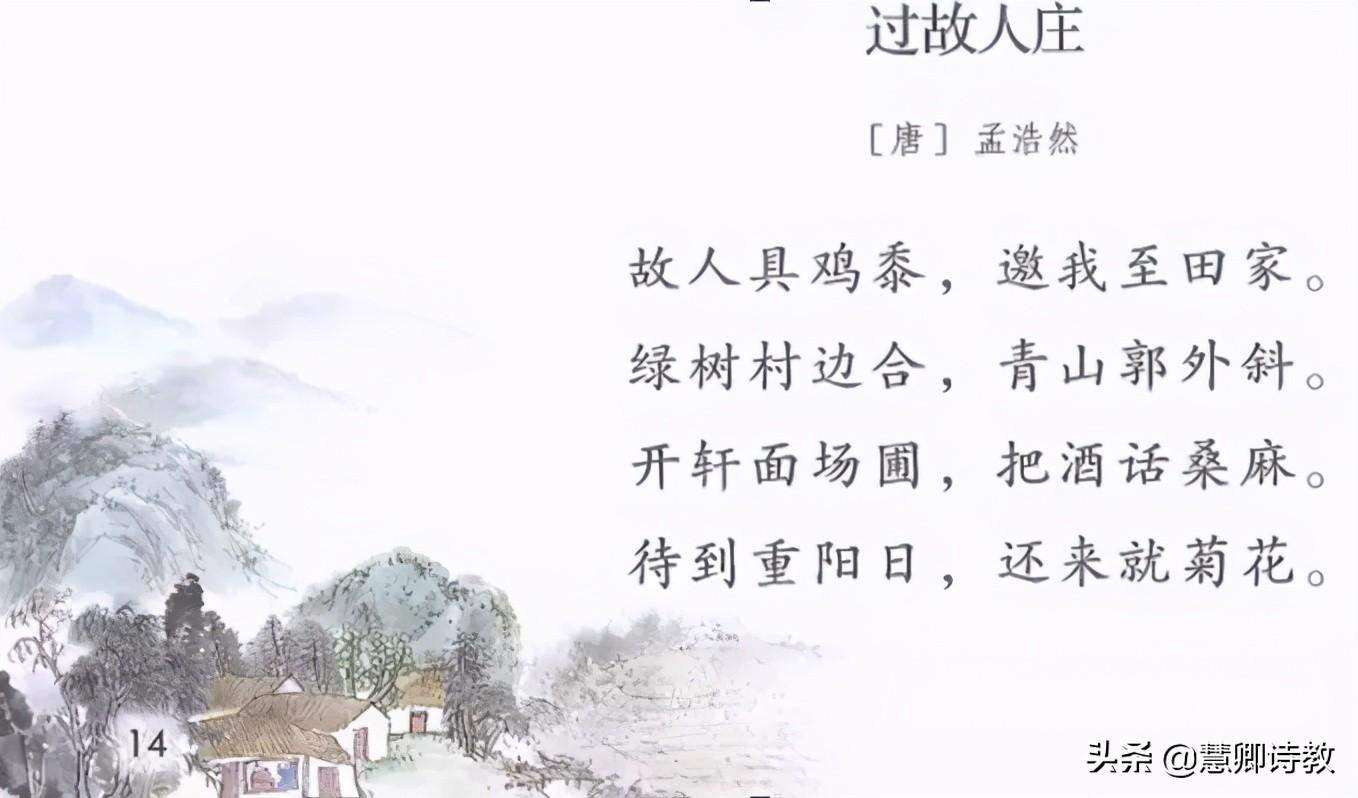 ●诗意:老朋友预备了丰盛的饭菜,邀请我到他的农家。翠绿的树林围绕着村落,苍青的山峦在城外横卧。推开窗户面对打谷场和菜园,手举酒杯闲谈庄稼情况。等到九九重阳节时,再来这里观赏菊花。