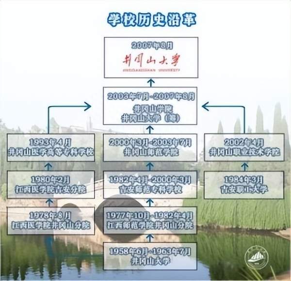 1958年11月底,四所学院同时迁往吉安市南部的神冈山;1958年12月,地委决定将四所学院合并,成立吉安地区第一所综合性高等学校―井冈山大学。