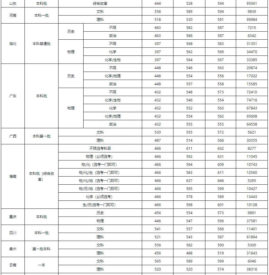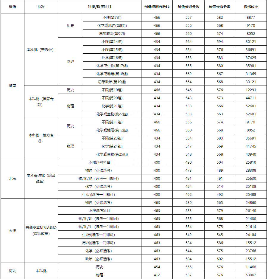 下面是2021年湖南科技大学普通类专业分省、分科类录取分数线: