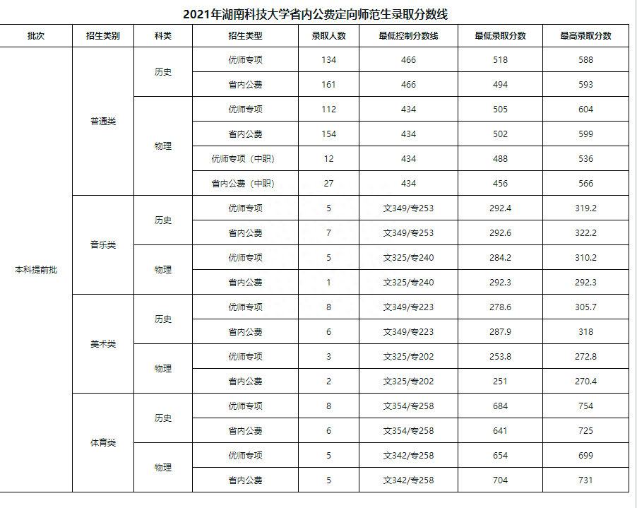 下图是2021年湖南科技大学省内公费定向师范生录取分数线: