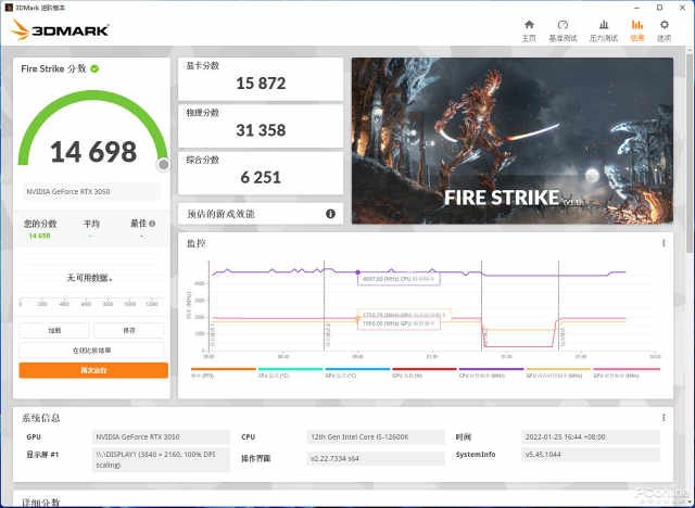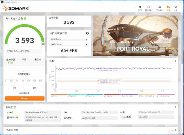 其外,RTX3050还配备了第二代RTCore和第三代TensorCore,使得入门级显卡首次拥有光线追踪技术和DLSS2.0技术的支持,可以看到耕升RTX3050追风的PortRoyal光追性能成绩表现不错,在下面的游戏实测中我们也会进行光追游戏测试。