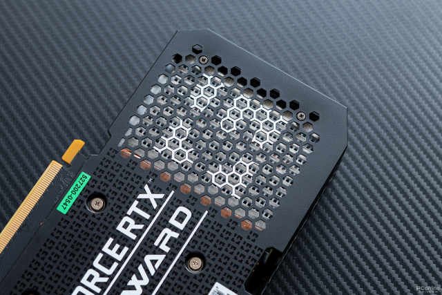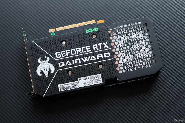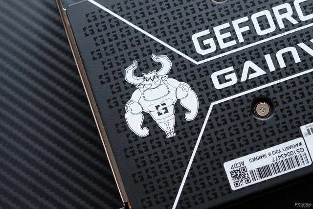 显卡背板印有一排排的耕升logo作为纹路点缀,左侧还印有一只耕升品牌的吉祥物“牛牛”。