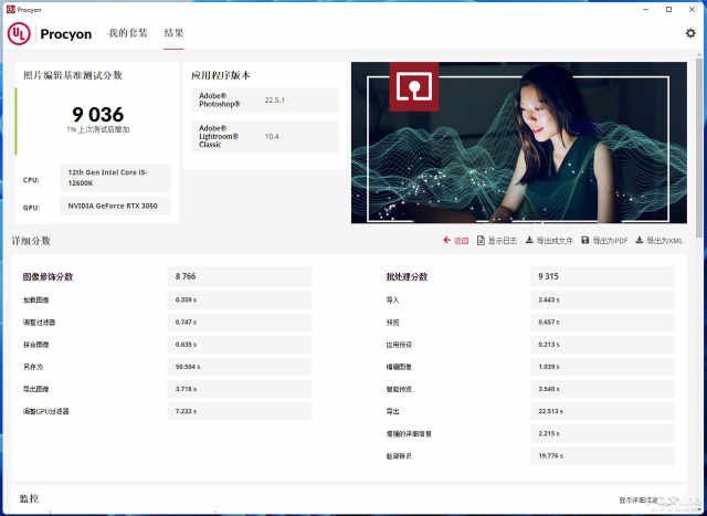 ULProcyon测试项目分为照片编辑基准和视频编辑导出两部分,照片编辑基准采用LightroomClassic和PhotoShop2021,视频编辑导出则是使用PremierePro2021进行测试。而PugetBench则分别对应PremierePro2021和DaVinci两个视频创作软件。