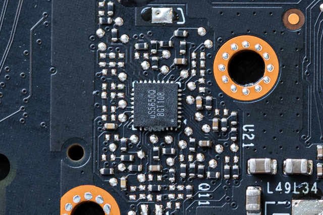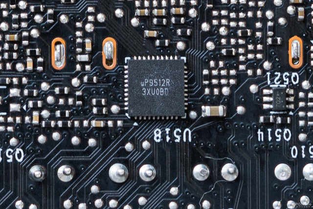 1相显存供电是来自sinopower的7342EK,内置上下桥设计。旁边是控制显存供电的PWM芯片uPIuS56500Q,这也是一颗在中端显卡上较为常见的芯片。