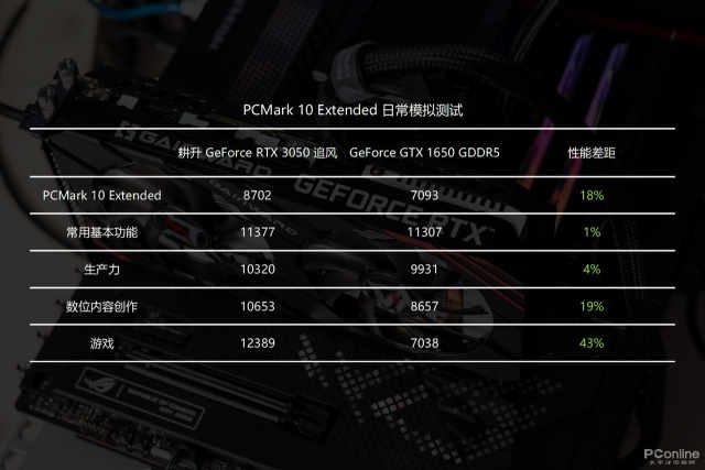 而在数位内存创作以及游戏方面则更加注重显卡的性能,可以看到耕升RTX3050追风凭借更强的显卡性能在这两项上优势明显,因此在总分上领先GTX1650达到18%。