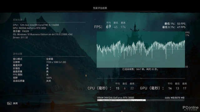 在游戏测试中,耕升RTX3050追风在1080P高画质的游戏设定下,帧数均超过了60帧,部分游戏甚至可以跑到将近100帧的水平,说明这块RTX3050的游戏性能能够满足大部分1080P分辨率游戏的需求,相比GTX1650达到平均35%以上的帧数提升,并且由于8GB显存的容量,避免了在某些画质较为精细的游戏中,因为显存容量不足导致帧数异常的现象。