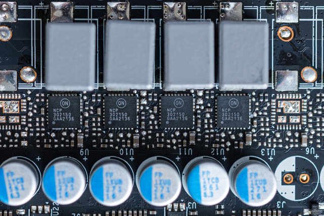 核心供电为DrMos芯片+固态电容+全封闭电感的设计,DrMos芯片是来自安森美的NCP302150,最高持续输出电流为50A,为中端显卡常见的芯片。