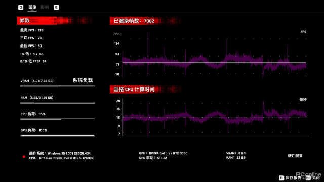 此外,我们还进行了1080P光追游戏测试,光追效果统一设置为高,DLSS统一设置为平衡,除了《边境》之外,其余三款游戏的都能达到60帧以上的流畅体验,如果你对帧数有进一步的要求,可以通过降低特效或者将DLSS调整至性能档位,来获取更流畅的游戏体验。