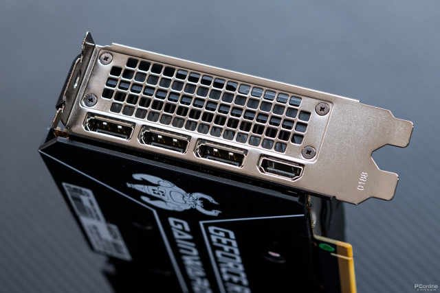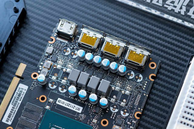 I/O接口挡板带有风道强化设计,下方是三个DP1.4a接口和一个HDMI2.1接口,最高支持8K分辨率输出。