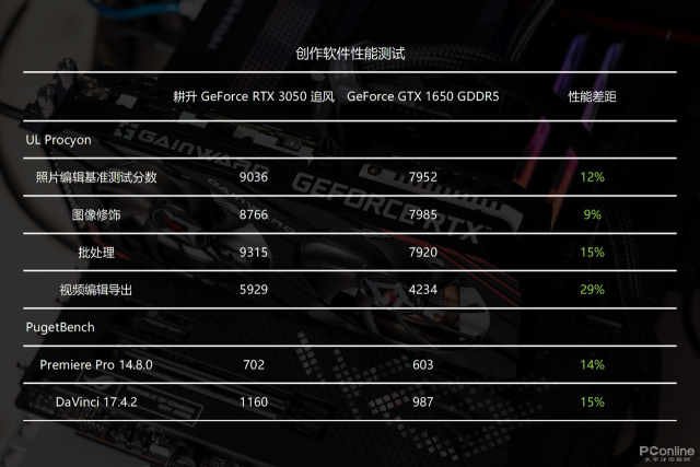 可以看到耕升RTX3050追风在媒体处理方面相比上代入门卡也拥有9%~25%的提升幅度,得益于Ampere架构更强的性能表现,耕升RTX3050追风在PS、LR软件的图片处理方面拥有较高的效率,同时也能兼顾日常视频编辑和导出。