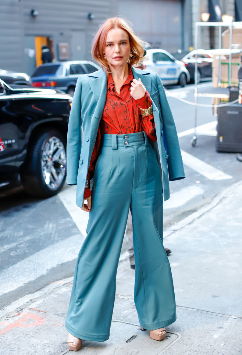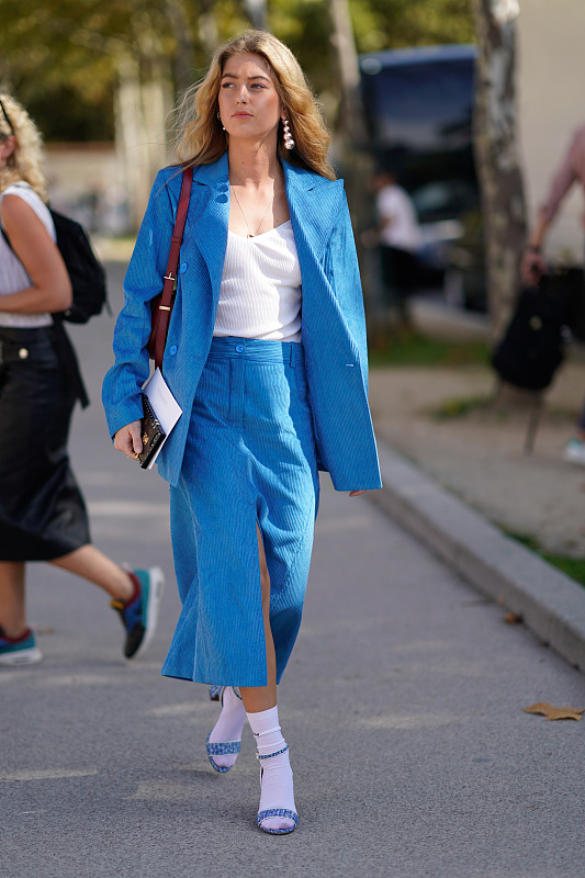 经常听人说自古红蓝出CP,湖蓝色和红色搭配也蛮美的。不过这两个颜色搭配不能用五五分的配色,最好是小面积点缀。比如穿一件湖蓝色的西装配同色阔腿裤,内搭穿一件红色的衬衫,红衬衫从西装的门襟里露出来,优雅又有层次感。