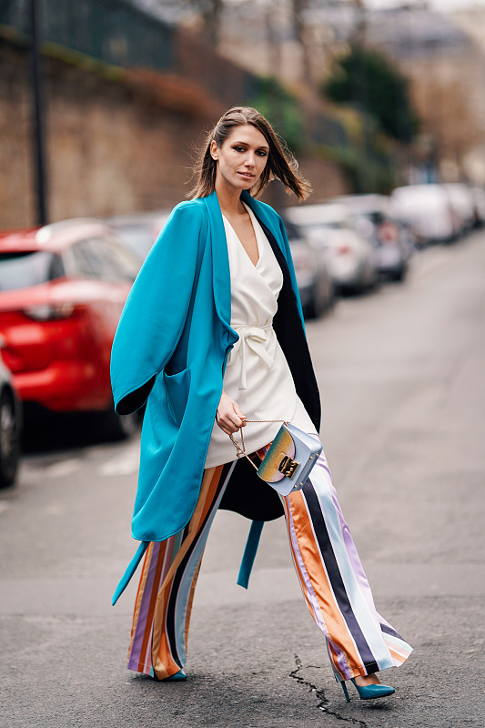 湖蓝色风衣搭配白色的连衣裙很清爽,一般人搭到这儿就行了。但潮人们这样还不够。在裙子里穿一条桔色蓝色和蓝色的条纹直筒裤也不错。脚上的鞋子是湖蓝色高跟鞋。和外套顺色。很时尚的一套搭配。这条彩色花裤子和湖蓝色也很配,因为裤子里有湖蓝色。这样的顺色很潮。