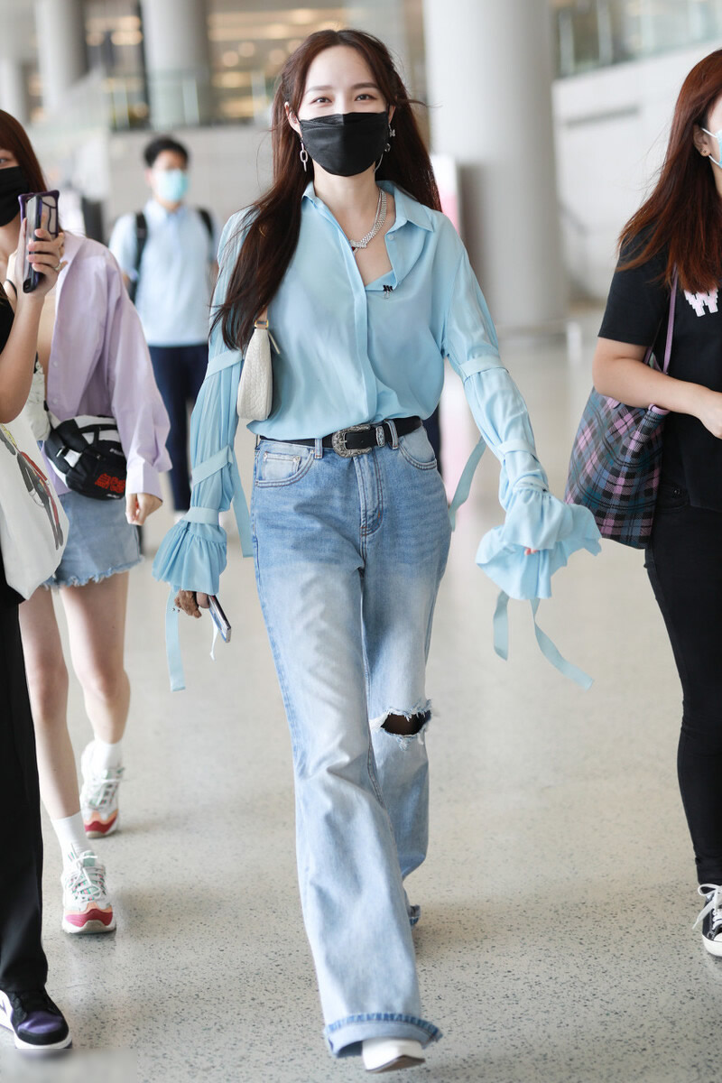穿白色的衬衫搭配湖蓝色的高腰半身裙很美。裙子上还来个大大的白色花朵,和白色的衬衫顺色,浪漫又优雅。湖蓝色和白色不管怎么搭配都是美的。这也是最保险的搭配。