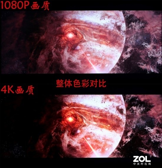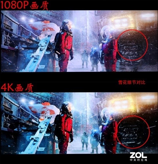 通过在电视上播放并拍摄对比之后,可以看到区别还是非常明显的。在细节表现方面,视频平台所提供的4K资源明显稍逊一筹,无论是空中纷飞的雪花还是木星周围的尘埃,都不够清晰。而且从色彩上来看,平台也对视频进行了调整,有着浓浓的滤镜味道,改变了导演想要表达的末日场景下的萧瑟感,所以总的来看,视频平台所提供的4K版本电影与原作相差甚远。